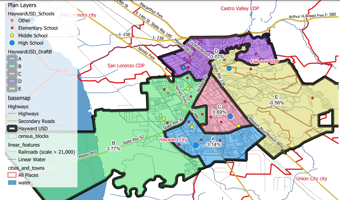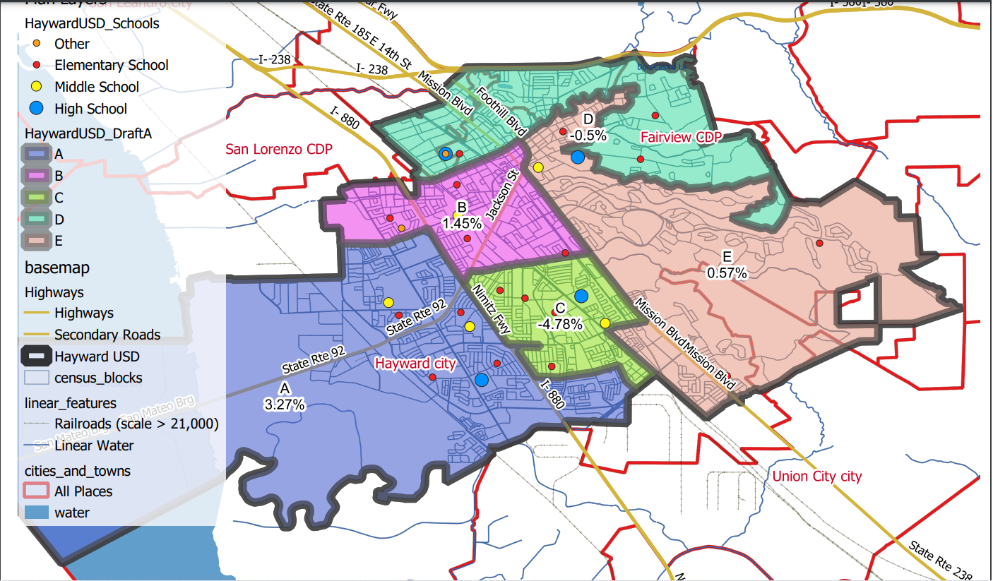At the last School Board meeting on May 22nd, the biggest public feedback seemed to come from the unincorporated areas wanting to be their own district—Map A takes that into consideration pretty well. The reasons ranged from silly—feeling left out because they don’t live in Hayward and the District’s slogan is “Made in Hayward”—to the reasonable—they don’t have the same resources at their disposal outside of City limits.