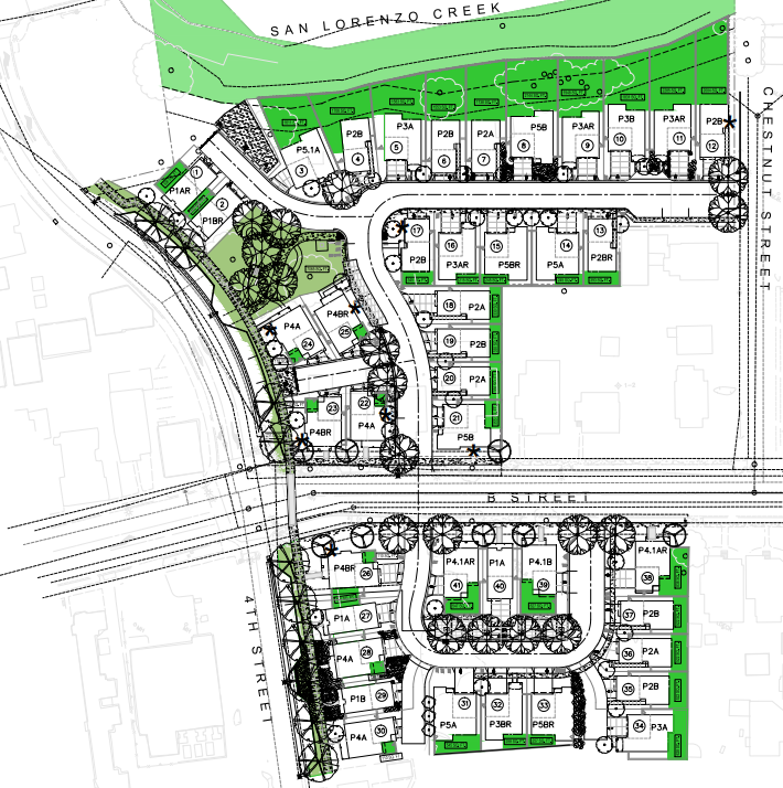 Each single family home will have a 2 car garage and at least 3 bedrooms—some of the main bedroom suites are almost 500 square feet! The plan includes a setback from the San Lorenzo/Lisjan Creek that will be under the purview of the California Department of Fish and Wildlife jurisdiction. The plans include two preserved oak trees, new crosswalks on 4th and B with traffic signal modifications, and 14 on-street parking locations in the development for visitors (and overflow resident cars). The developer is also paying to underground the utilities along the B Street frontage.