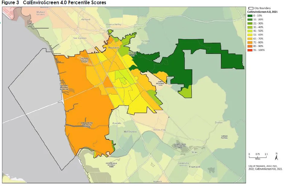 The above map is the CalEnviroScreen map, which includes many factors like emissions and income. The GHG Emissions Inventory was a separate pie chart. However, not including the airport in the GHG emissions is a massive oversight, especially considering most aircraft still use leaded gasoline. However, Councilmember Zermeño pointed out that the Hayward Executive Airport recently added facilities so that plane owners could purchase unleaded gasoline.