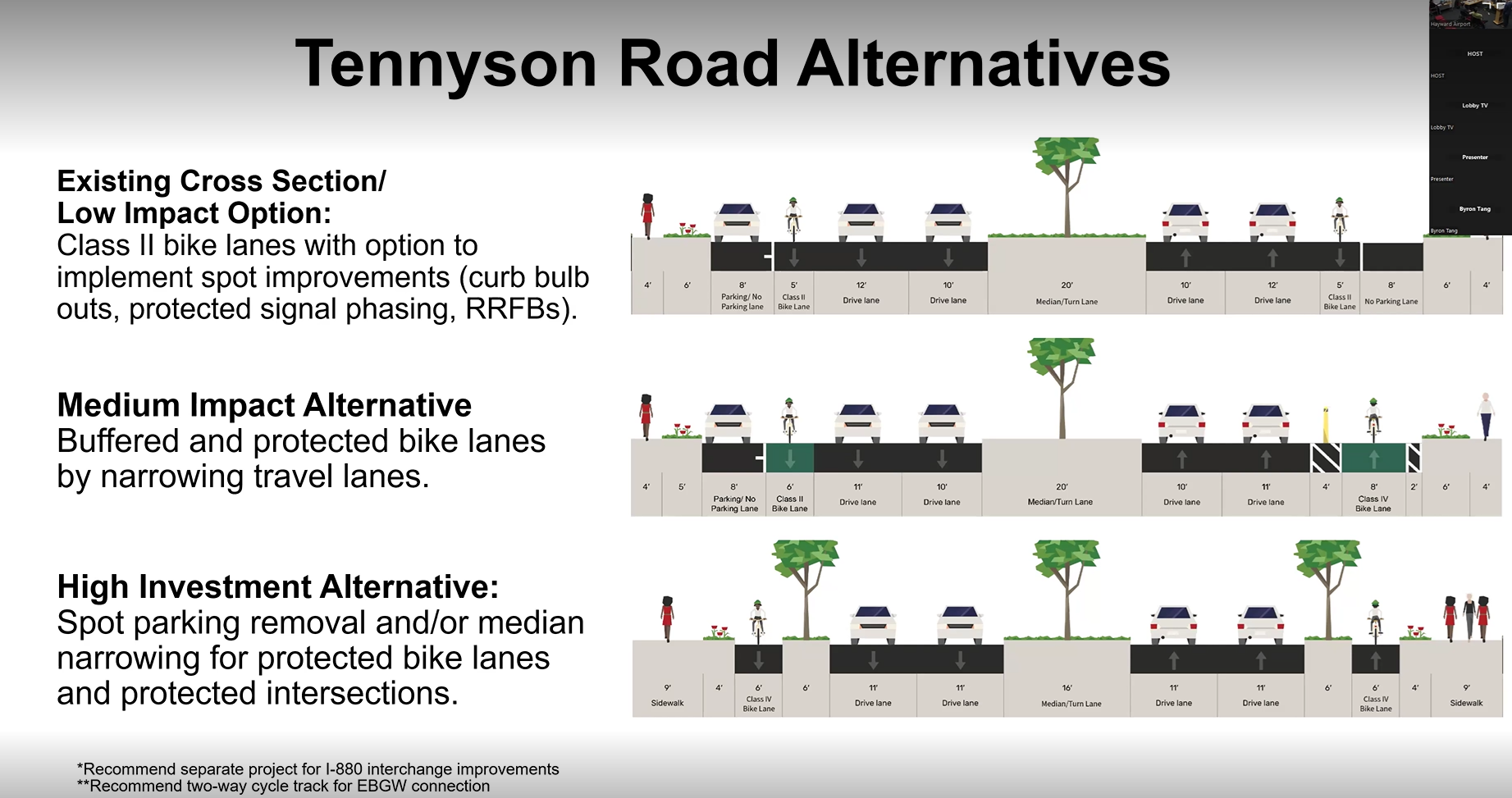The City is looking to improve safety on some high-injury corridors across town. Three of the biggest offenders are A Street, B Street, and Tennyson Road, which are a part of the City’s High Injury Network—a series of streets that make up only 14% of the City’s road miles but where 75% of all fatal accidents/serious injuries occur. After a lot of outreach, the committee was faced with a few options on what to do for each street.