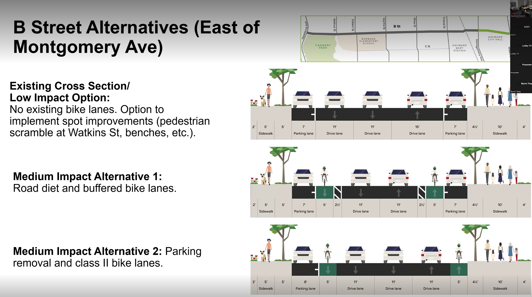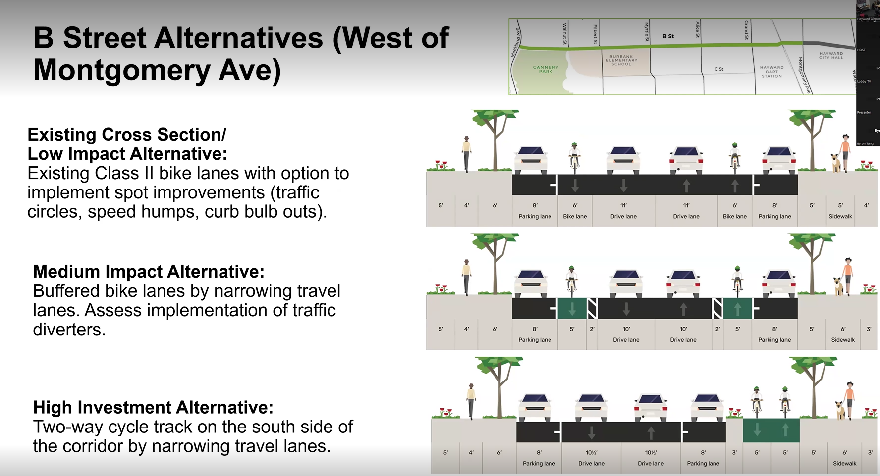 B Street is divided into two sections: West and East of Montgomery Ave—where the BART Station is. This section goes from the BART station to Cannery Park. The Medium Investment Alternative would essentially extend the conditions West of Grand all the way to the BART station. The High Investment Alternative would be a big change and make a two-way cycle track on one side of the street.