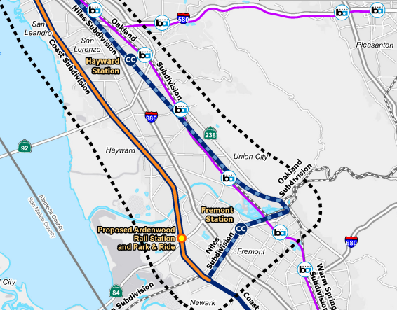 The Capitol Corridor Joint Powers Authority (CCJPA) is proposing to change the route for the Capitol Corridor trains through Hayward. Rather than using the Niles Subdivision (where it currently exists), the train would use the Coast Subdivision though the industrial area.