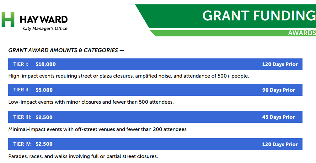 Councilmember Zermeño wanted to give priority to organizers in Hayward and Councilmember Syrop agreed. “We should definitely prioritize groups that are coming from Hayward,” he said. “These are Hayward events.” Councilmember Zermeño then asked Staff to clarify which events have to use Hayward branding on their promotion. Staff said only Marquee events would need to use it, not regular grantees.
