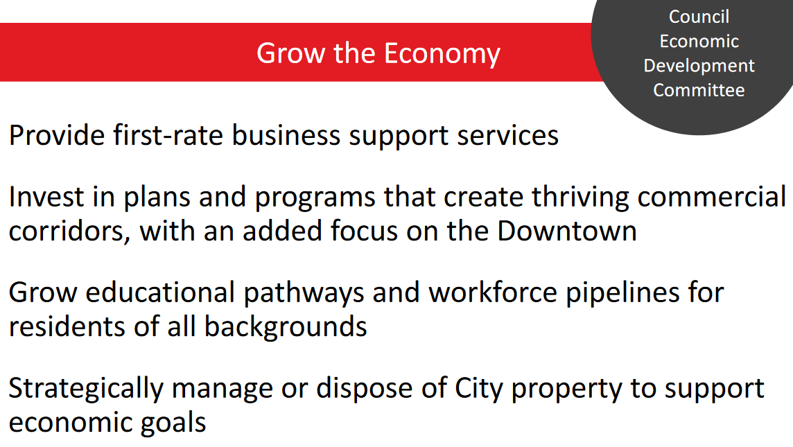 The Education City lens feels a little more vague, with the main plans being to grow educational pathways (make sure kids get to College) and workforce pipelines (from high school or college to jobs), and provide educational programming. That this will live under the Library is an interesting choice and follows Mayor Salinas’ pattern of wanting to put every community service that doesn’t have a place under the Library. This habit is not unique to Mayor Salinas, as libraries across the country constantly struggle with taking on services that they are unequipped and ill-funded to provide.