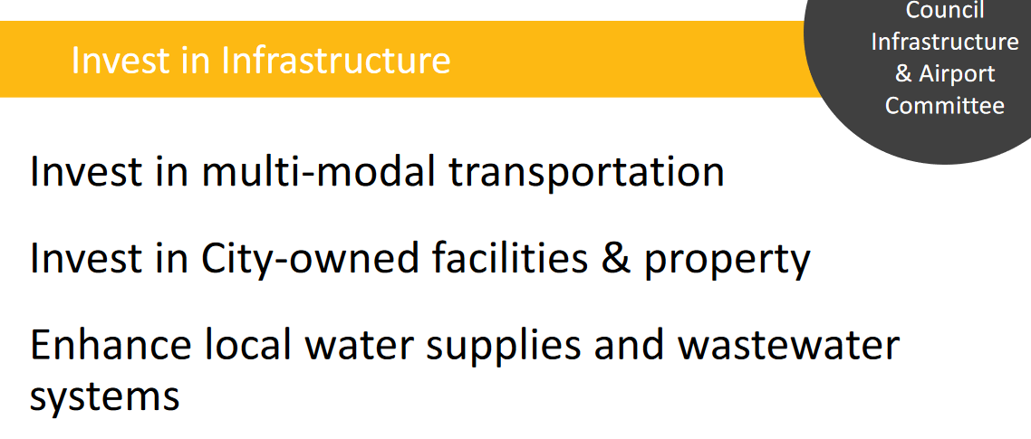 Infrastructure was one that got me excited—especially since one of the projects is “Explore alternatives to the Downtown Loop.” But there were also some other big projects around parks and public transit. There is also a plan to create a Recycled Water plan and a Sustainable Groundwater plan—both of which will be key for our water-starved community.