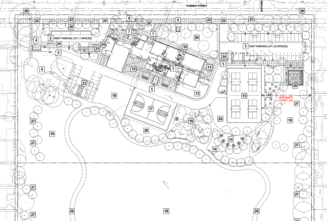 However, the park improvements will be more limited in scope than was previously imagined. The majority of the park area will be given over to open grass with a walking path. The other improvements will be clustered around the new community center and include picnic areas, the ubiquitous Pickleball courts, a full-court and half-court basketball area, and a daycare play area.