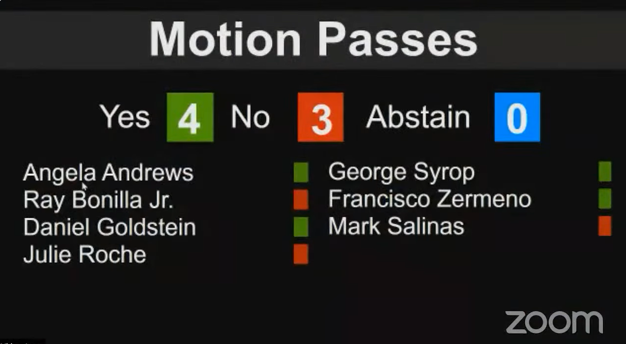 “We’re listening, but we’re also trying to do the responsible thing up here. Okay?” Mayor Mark Salinas said, “And I have to agree with my colleagues Councilmember Bonilla, Councilmember Roche, and Councilmember Andrews. …It is irresponsible. I cannot stress that enough.” He then countered that, should the motion fail, he would entertain a referral from Councilmember Syrop to direct Staff to research and develop a Socially Responsible Investment Policy. A process which would, at best, take months. “I think that’s what we’re after here,” he said.