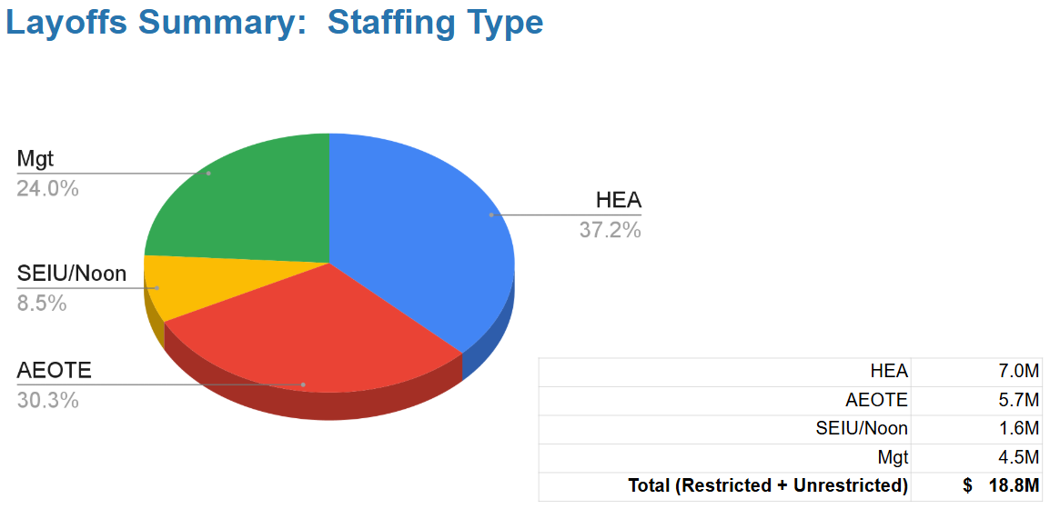 By money saved, the largest cuts were from HEA, the teacher’s union, with AEOTE coming next—they’re administrative staff. Management was only 24% of the layoffs by cost, because there are just fewer administrators to cut. By cost, the biggest impact will be felt by AEOTE and Management, which makes sense since everyone said they wanted most of the cuts to come from the District Office.