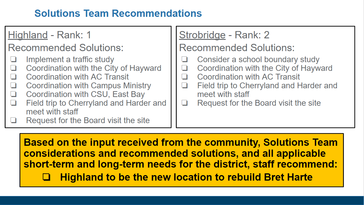 The traffic study and coordination with multiple agencies will take some time, but the Board voted unanimously to move Bret Harte to the Highland site.