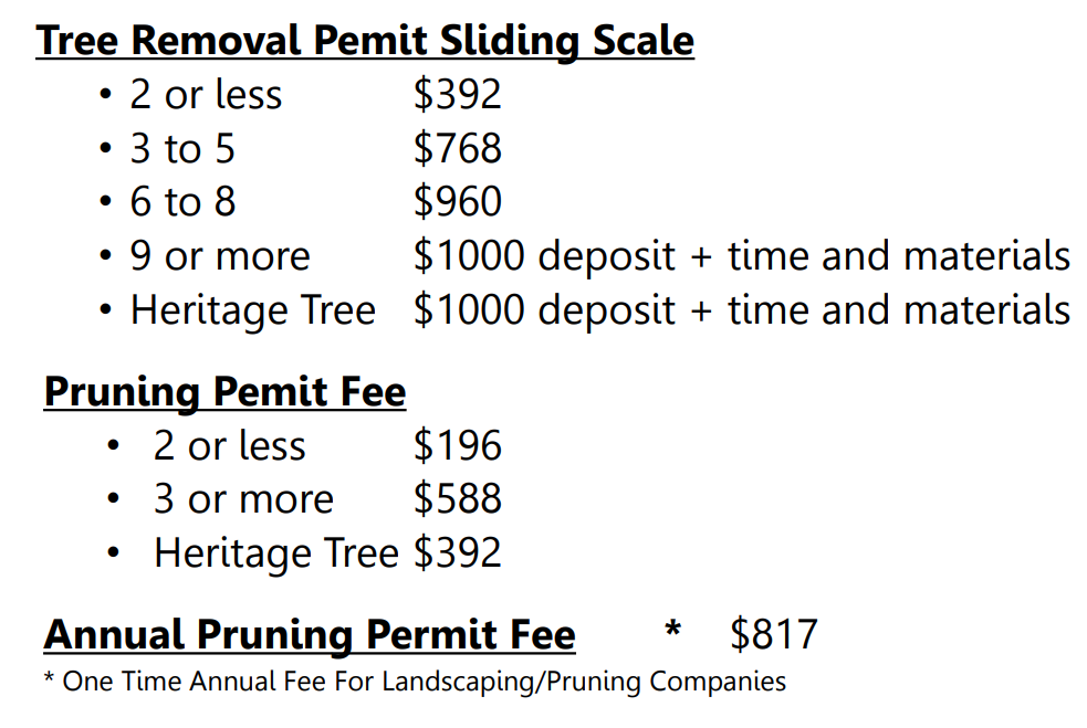 The actual fine—which is a technical nuance here—would be double the permit fee, which is $490 right now but could be less if the sliding scale is approved. You’d then have to use the appraised value to replace the tree on top of the actual fine.