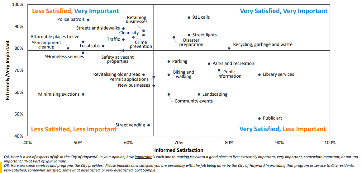 The above chart lists a bunch of things ranked by how important they are to people and how satisfied they are by the service. The important stuff is above the horizontal line, and the things they aren’t satisfied with are to the left of the vertical line. Notably, Street Vending is the item of least concern, while things like encampment cleanups, affordable housing, crime, and streets and sidewalks are some of the more important things that people aren’t satisfied with.