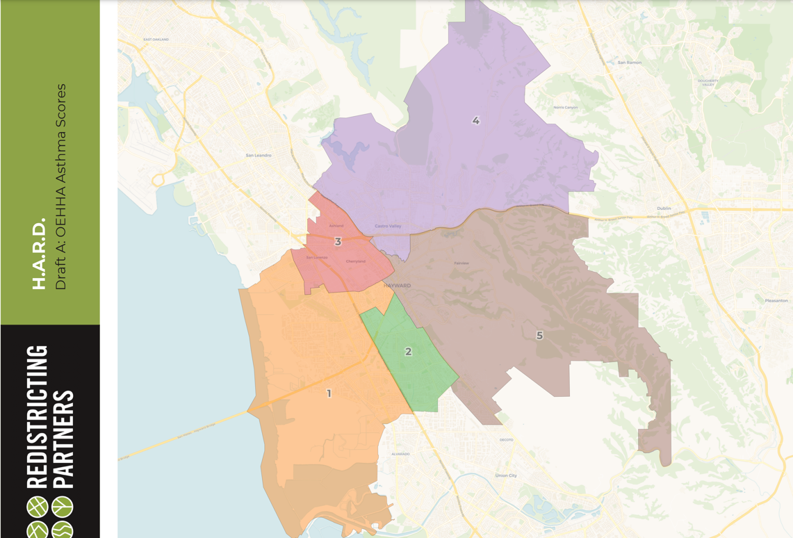 This map uses health impacts to create the districts. Those who experience similar health impacts, most notably asthma, from being near highways and other industrial areas. It also tried to maintain Hayward neighborhood boundaries, unincorporated places, and the communities of Ashland, Cherryland, and San Lorenzo.