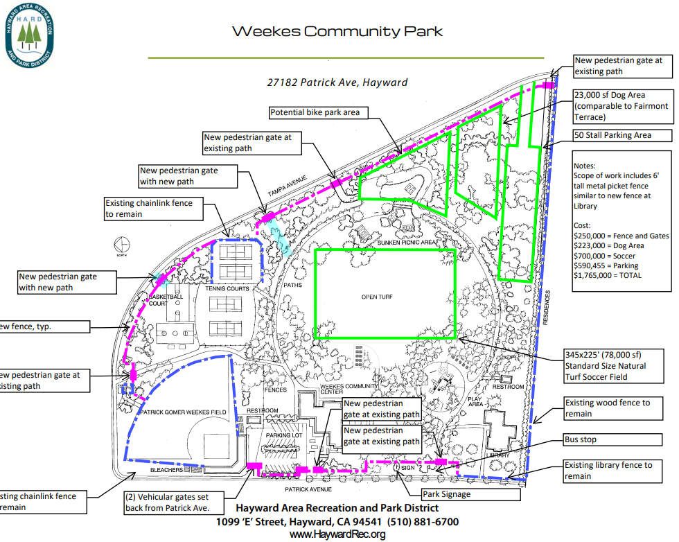 Shortly after the Weekes Park sweep, the January 21st HARD Board of Directors meeting had a Study Session on “Weekes Community Park Improvements.” The improvements include a bike park area, a full sized soccer field, a 23,000 square foot dog park, and a 50 stall parking lot. The most surprising addition, however, was a new fence completely enclosing the park.