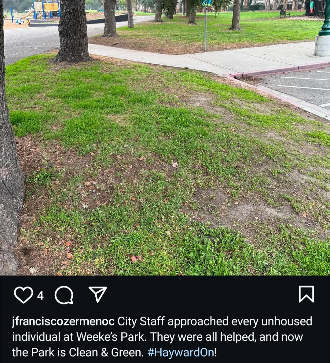 At the time of the sweep, only 4 people were still there—everyone else had moved on. And, if you believe Councilmember Zermeño, “They were all helped, and now [Weekes Park] is Clean & Green. #HaywardOn!”