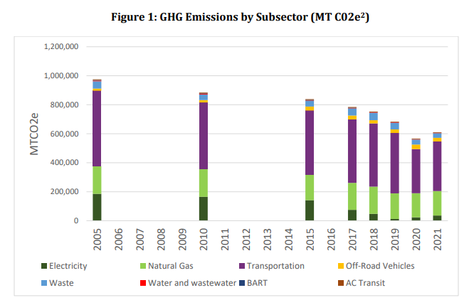 Hayward has a goal of Carbon Neutrality by 2045. The good news is that we’re ahead of schedule (the next goal is 30% reduction from 2005 levels by 2025). The bad news is that the only reason we’re so far ahead is because of 2020 and we’re backsliding. The majority of the Greenhouse Gas (GHG) Emissions come from “Transportation” which is every vehicle that isn’t public transit or construction vehicles.