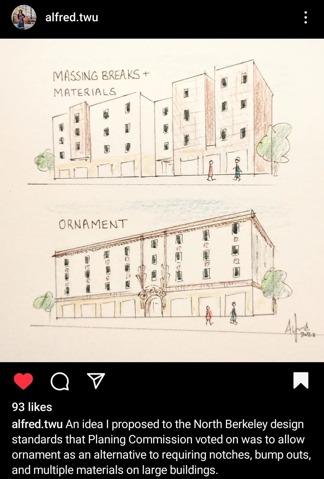 The main concerns are that there’s a big push for “variation of street-facing façade plane depth” which is muni-speak for pushing outside walls in and out. This also takes the form of “step backs” where the upper floors are smaller than (or stepped back from) the lower floors. It’s supposed to make buildings feel less blocky and ugly. However, we’re with architect and former AC Transit Supervisor candidate Alfred Twu in thinking that ornamentation can also have a similar effect with lower construction costs and forcing things less toward that particular look everyone seems to hate